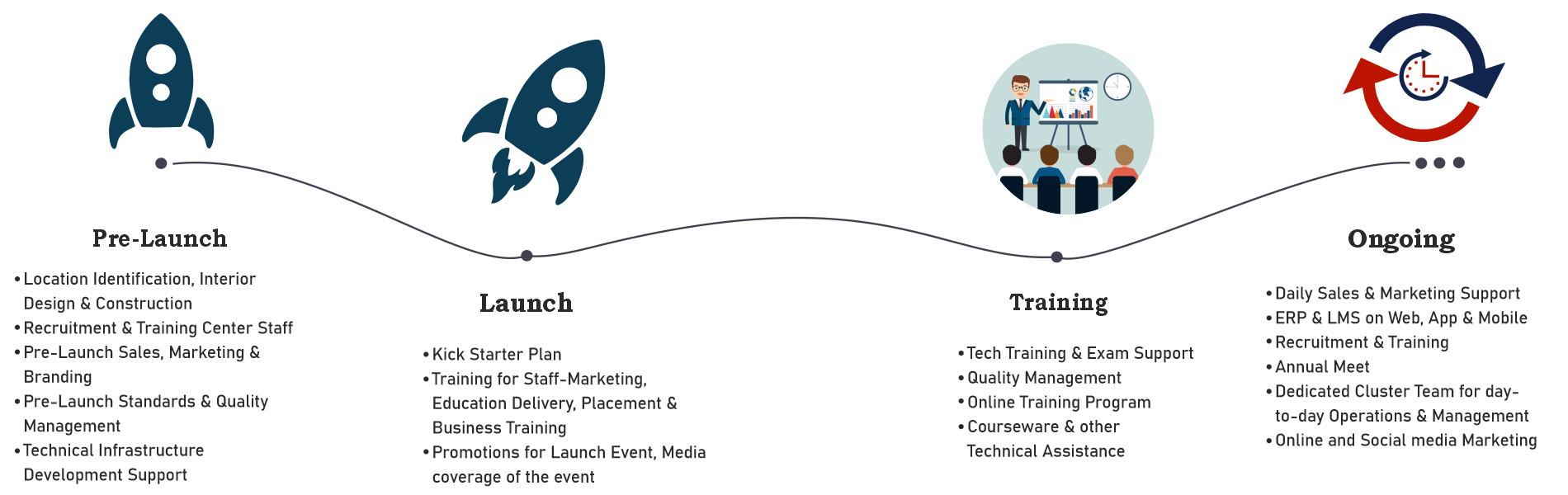 We help you identify the best location when you take up our education franchise in India, and aid you in the design and construction of your centre. We also help to recruit the right team members and train them for peak performance.